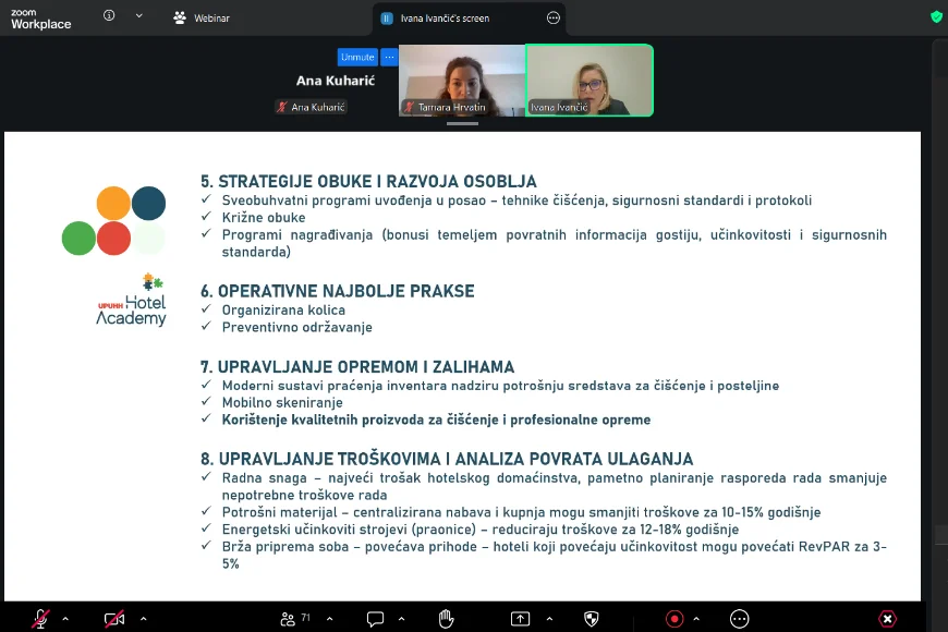 Webinar su vodile doc. dr. sc. Ivana Ivančić (Fakultet za menadžment u turizmu i ugostiteljstvu) i Tamara Hrvatin (Valamar Riviera d.d.), koje su kroz spoj akademskog i operativnog iskustva sudionicima približile praktične pristupe upravljanju učinkovitosti u hotelskom domaćinstvu.