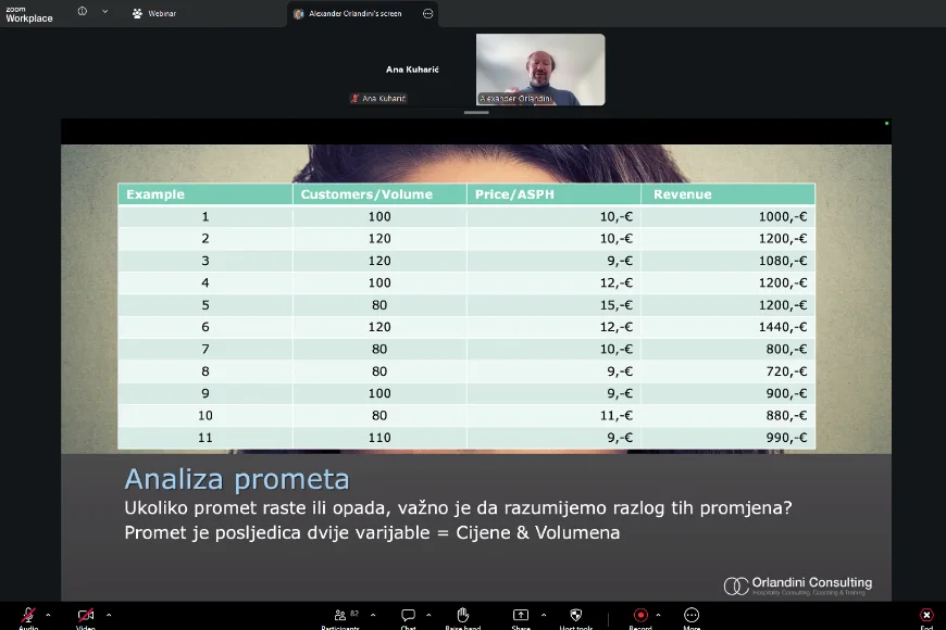 Webinar je okupio predstavnike hotelskog menadžmenta i operativnih timova, a kroz konkretne primjere iz prakse sudionicima su predstavljeni pristupi koji mogu doprinijeti povećanju prihoda i unapređenju kvalitete usluge u F&B odjelima hotela.
