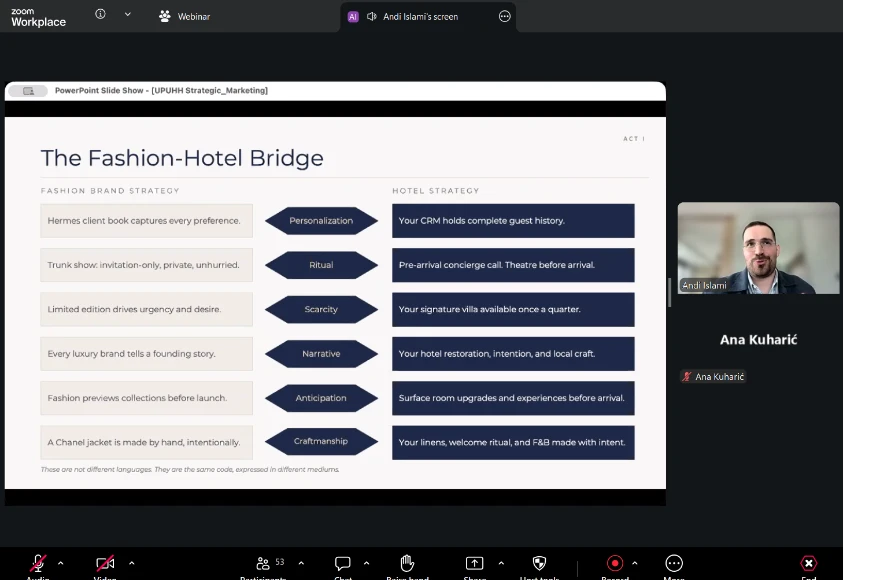 U okviru programa UPUHH Hotel Academy – projekta “Fast Forward to Excellence”, 9. travnja 2026. godine održan je webinar na temu “Strategic Marketing & Sales in the Luxury Industry”.